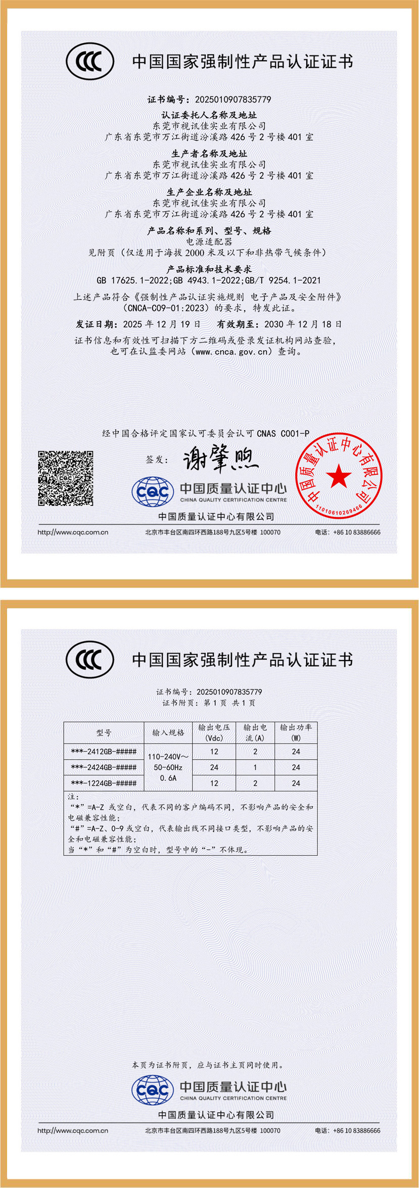 六、60W 绿电GB系列直插式 电源适配器3C证书: