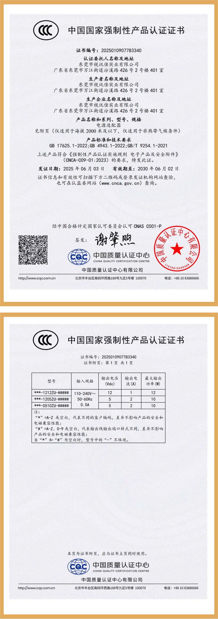 一、12W 绿电ZU系列双线式电源适配器3C证书: