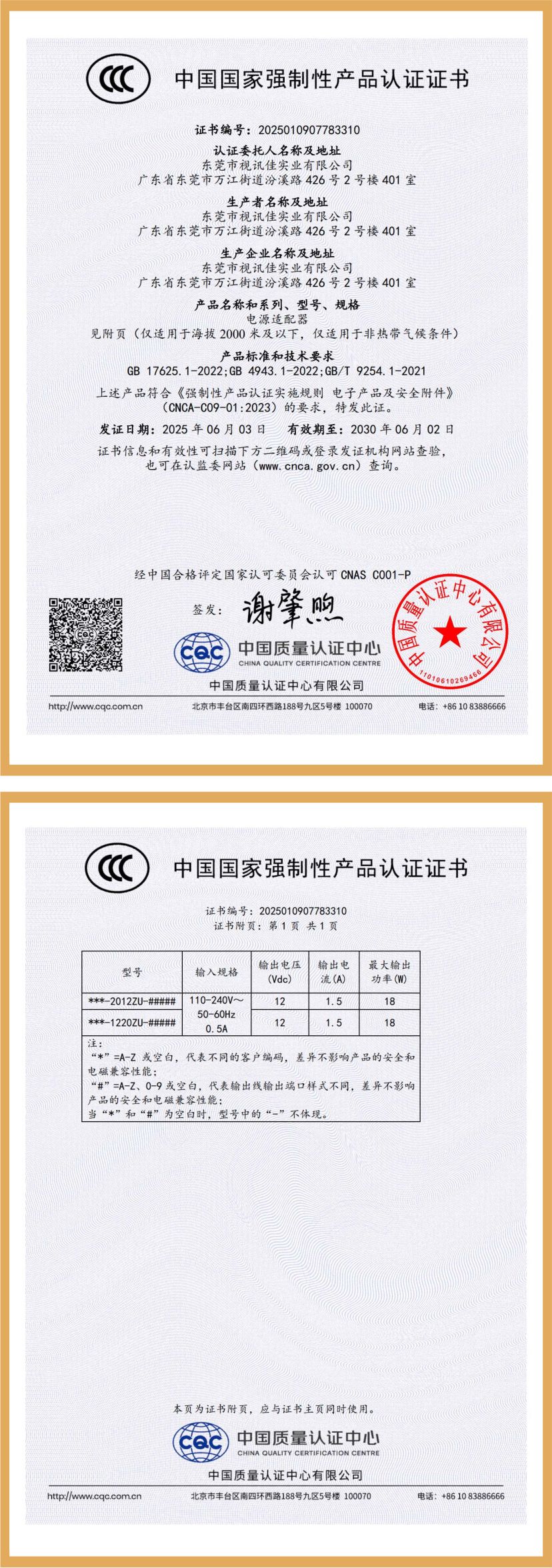 二、18W 绿电ZU系列双线式电源适配器3C证书:
