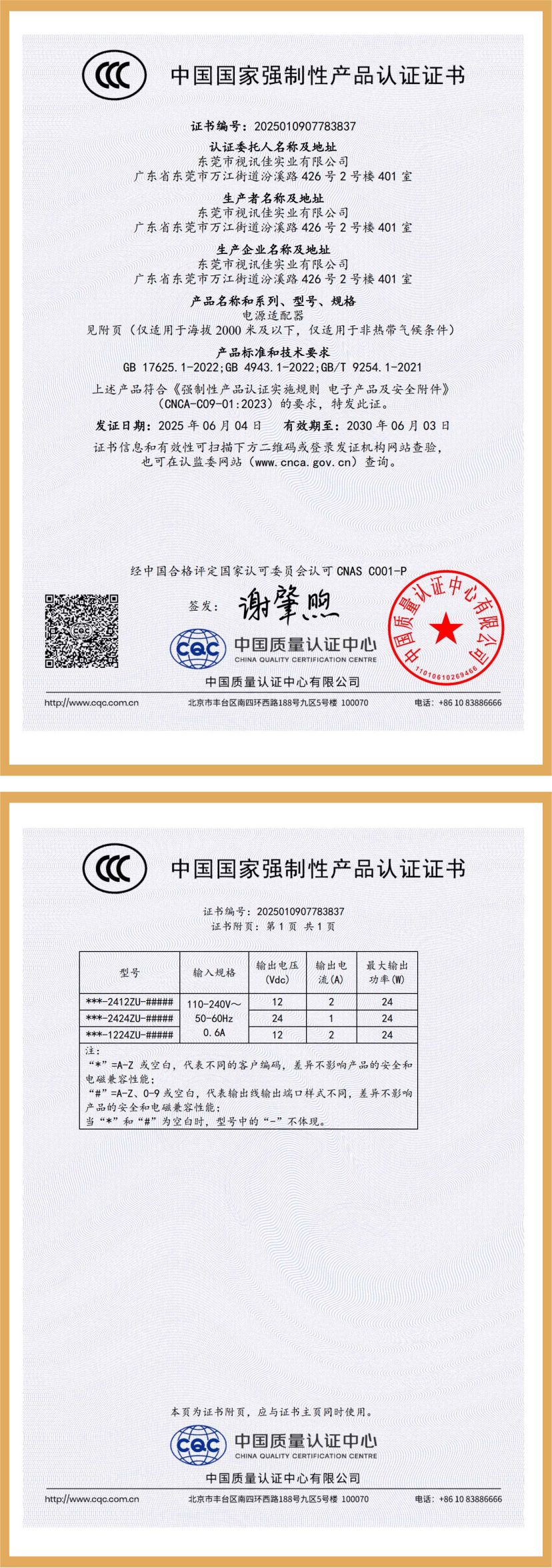 三、24W 绿电ZU系列双线式电源适配器3C证书:
